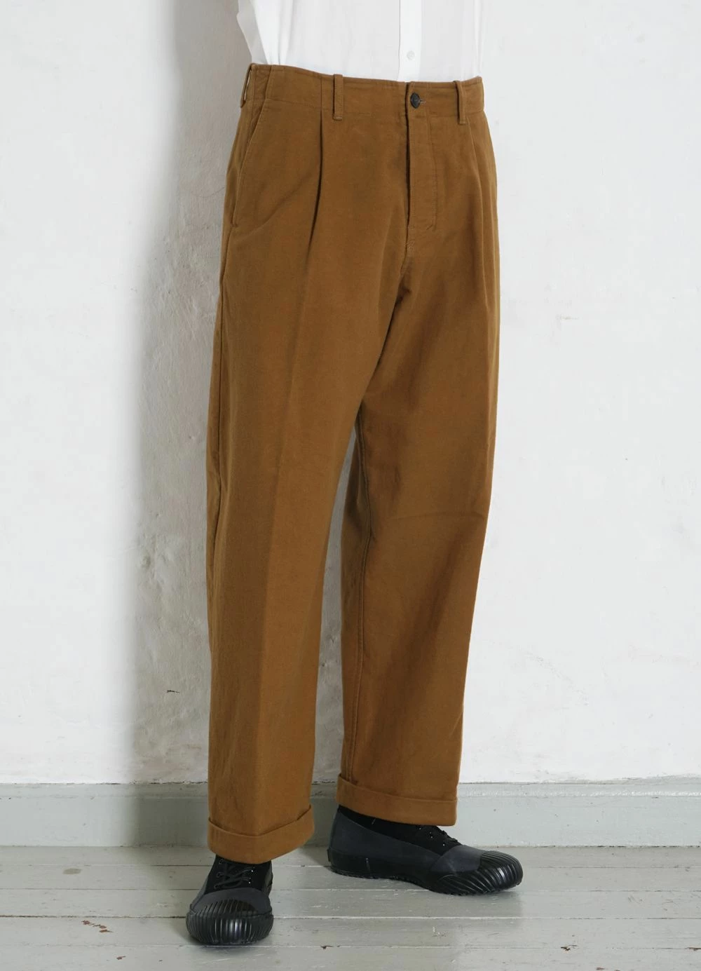 BOBBY is a newcomer for the AW21 season. The legs are cut super wide with a bit tapered leg and a twisted side seam. Details include single pleat fronts, welted back pockets, button fly and fold-up cuffs.