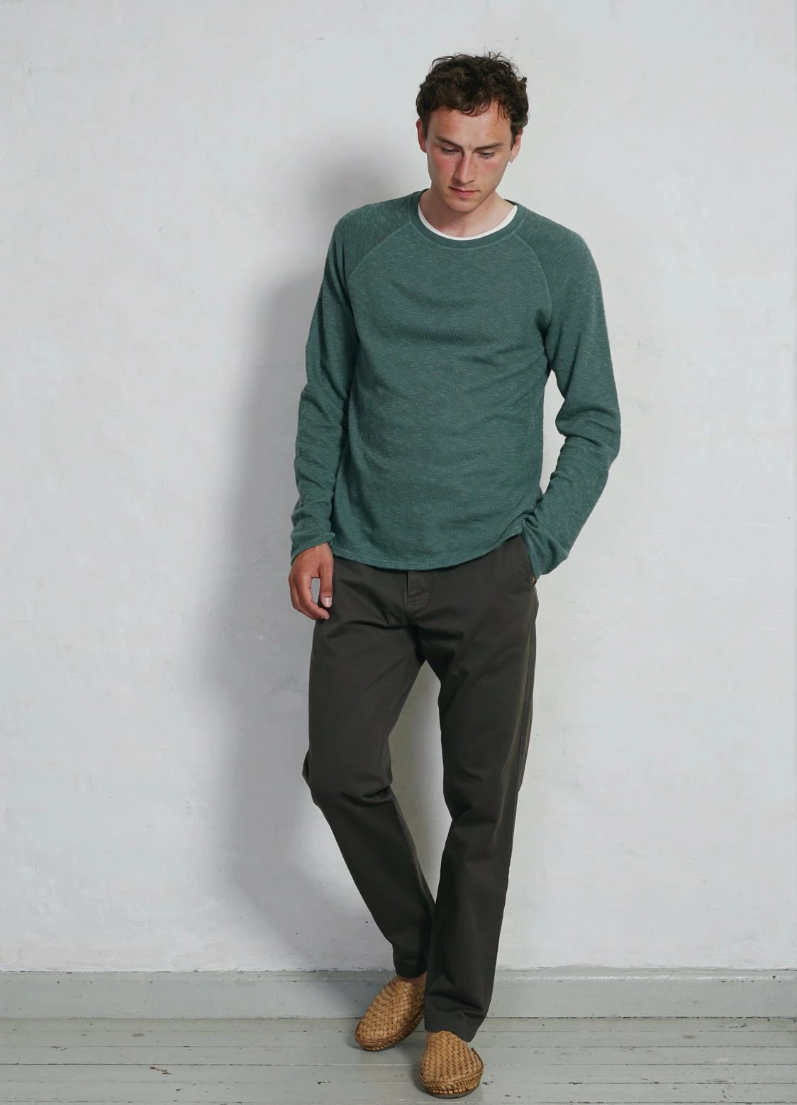 FELIX is a long sleeve crew neck Tee with Raglan sleeves. It is garments dyed and comes with flatlock stitching and a cotton herringbone tape at the neck. FELIX comes in 3 garment dyed colours.