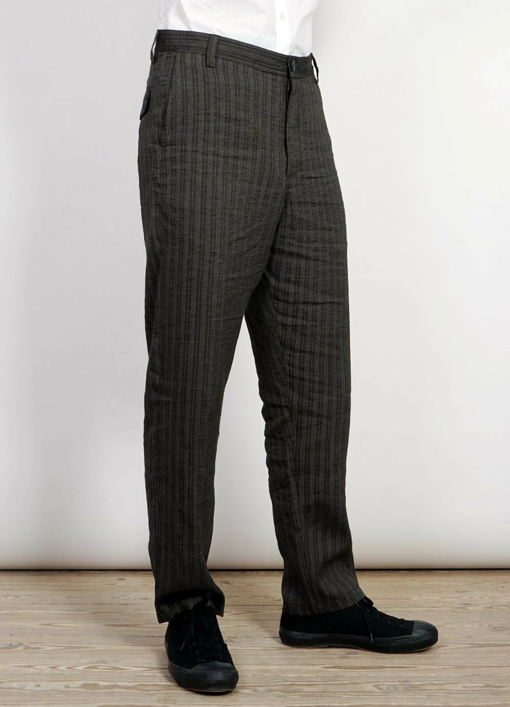 The linen gives a cooling and strong fabric. The viscose has a heavy drapery feeling and the uneven stripes give structural surface.