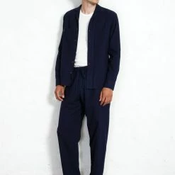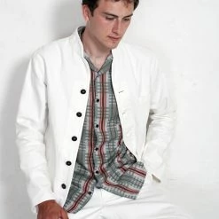 An Italian sturdy cotton Herringbone weave. For a softer and casual feel the garments have been over-dyed, washed and tumbled.