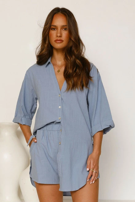 - mid-high rise dusty blue shorts